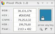 There is, however, and easier and faster way. A small free utility called Pixel Pick, weighing it an under 400KB in size, lets you see the RGB, HEX, CMYK, HSB, and Pixel values of the exact pixel under the tip of your cursor.